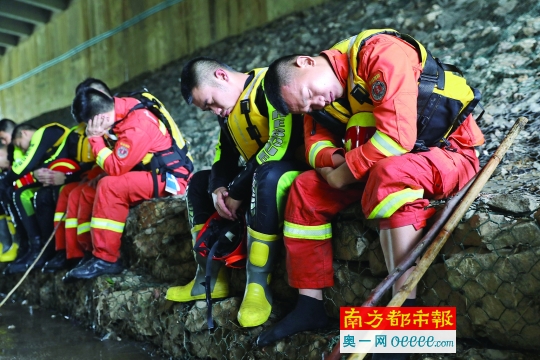 凌晨5点半,经过彻夜的紧张搜救,疲惫的消防指战员终于关掉了手电和头灯,坐在岸边略作休整。天刚刚擦擦亮时,指战员手牵手进到河道,开始了新一轮的地毯式搜救,试图用足去触碰到可能被淹在水下的失踪人员,一遍又一遍。