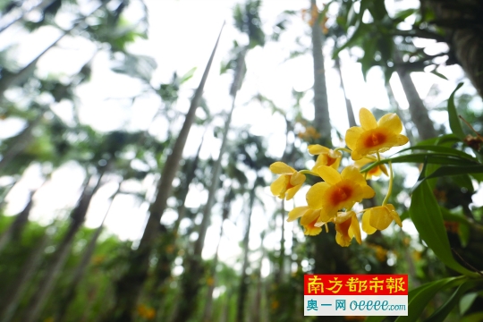 该区域主要种植的是鼓槌石斛、重唇石斛、小黄花石斛、版纳蝴蝶兰、金钗石斛、翅萼石斛、美花石斛等,它们同样环绕树木而长,但与兰谷里深色系树木不同,在落羽纱、大王椰的浅色背景下,此处的兰花更显清新可爱。可见之处,以黄色的鼓槌石斛为最多,白紫结合的重唇石斛为其次,均以团簇呈现。